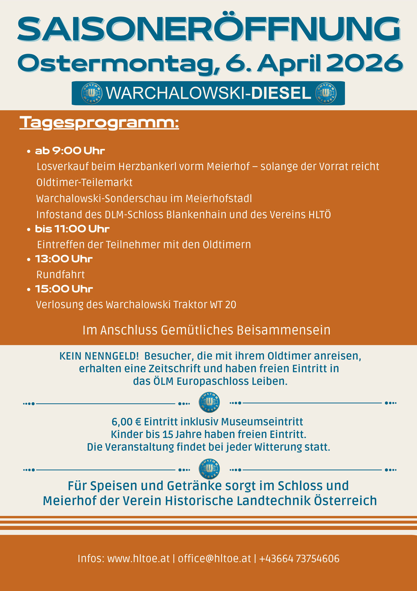 Der Verein Historische Landtechnik Österreich lädt herzlich zur Saisoneröffnung ein. Egal ob Traktor, Standmotor, Auto oder Motorrad – alles ist willkommen. Ein besonderes Highlight in diesem Jahr ist das zweite Warchalowski-Treffen inklusive Sonderschau.